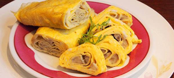 小火烧热锅底,涂一层油,倒入蛋液摊成蛋饼,将熟之际,把熟鱼泥摊上,卷成蛋卷。